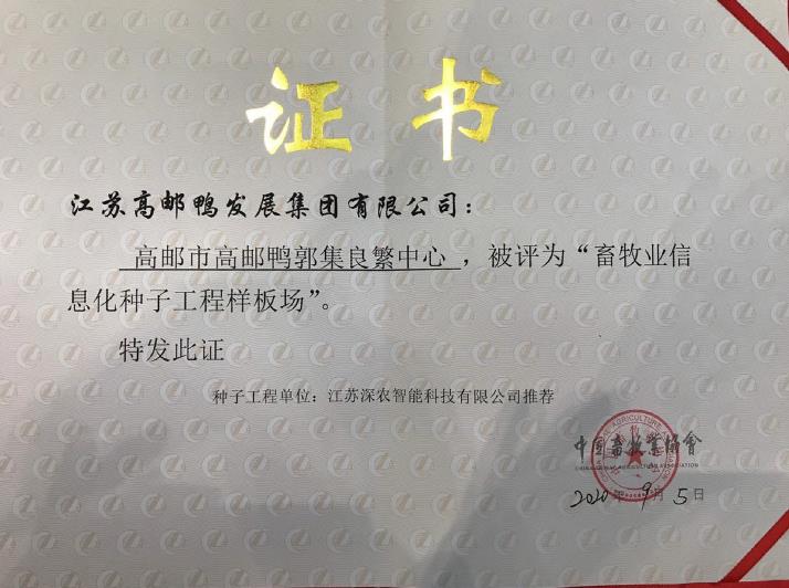會(huì)中,經(jīng)過(guò)嚴(yán)格的資質(zhì)審查與專(zhuān)家評(píng)選,江蘇高郵鴨集團(tuán)郭集良繁中心被中國(guó)畜牧業(yè)協(xié)會(huì)授予“畜牧業(yè)信息化種子工程樣板場(chǎng)”榮譽(yù)稱(chēng)號(hào)。