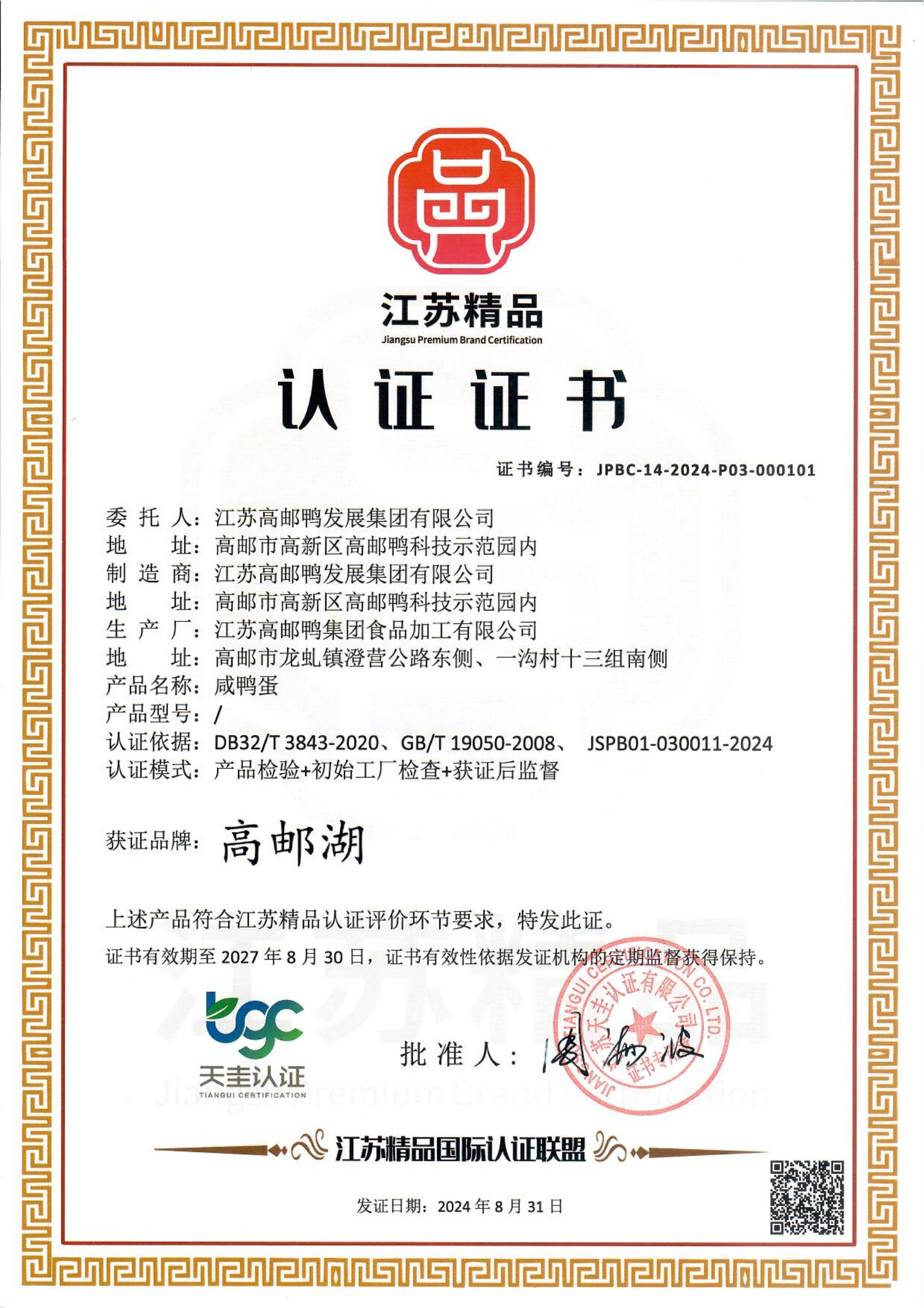 江蘇高郵鴨集團成功獲得“江蘇精品”認證