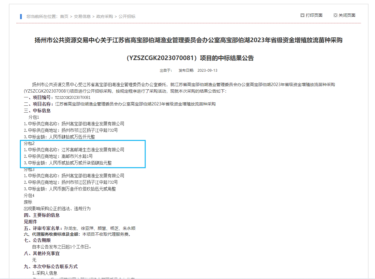 根據(jù)揚(yáng)州市公共資源交易中心的中標(biāo)公告,高郵湖漁業(yè)公司中標(biāo)江蘇省高寶邵伯湖漁業(yè)管理委員會辦公室高寶邵伯湖2023年省級資金增殖放流苗種采購項目,中標(biāo)金額為22.5萬元。